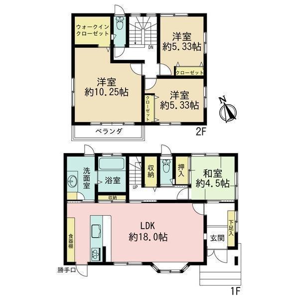 1F LDK 18.0帖 、1F 和 4.5帖 、2F 洋 10.2帖 、2F 洋 5.3帖 、2F 洋 5.3帖