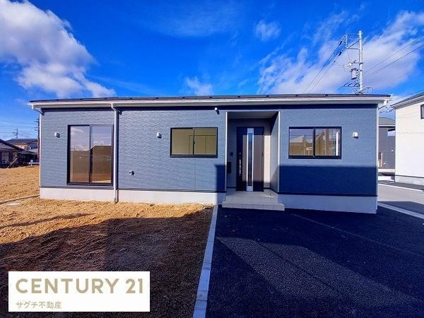 シンプルなデザインが際立つ平屋の外観です。大きな窓からは自然光がしっかりと入ります。清潔感のある色合いが魅力です。前面には駐車スペースも確保されています。