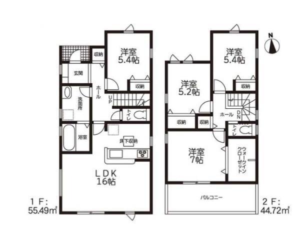 LDK16帖と広々とした空間が特徴です。各居室に収納スペースが充実しています。2階にはウォークインクローゼットが付いています。バルコニーも設けられており使い勝手の良い間取りとなっています。