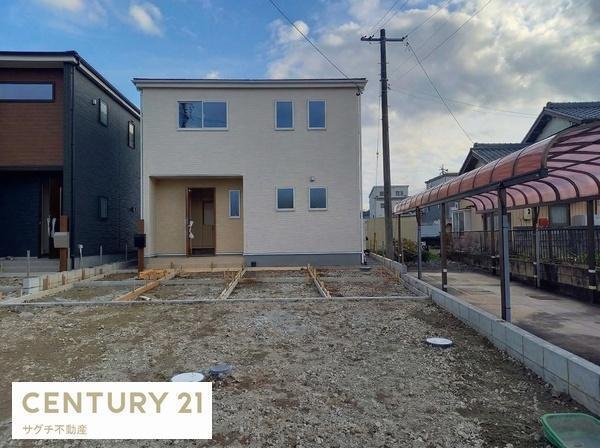 シンプルなデザインの外観が特徴です。敷地内にはゆとりのある駐車スペースがございます。周辺は広々とした空間で開放感があります。青空に映える外観です。工事が進行中の状態も確認できます。