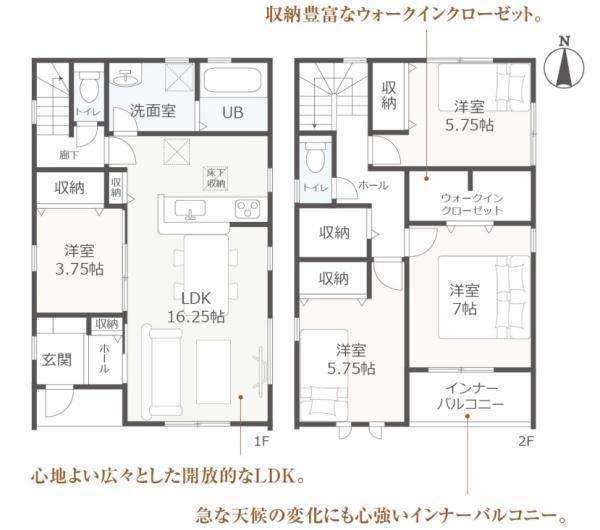 1F LDK 16.2帖 、1F 洋 3.7帖 、2F 洋 5.7帖 、2F 洋 7.0帖 、2F 洋 5.7帖