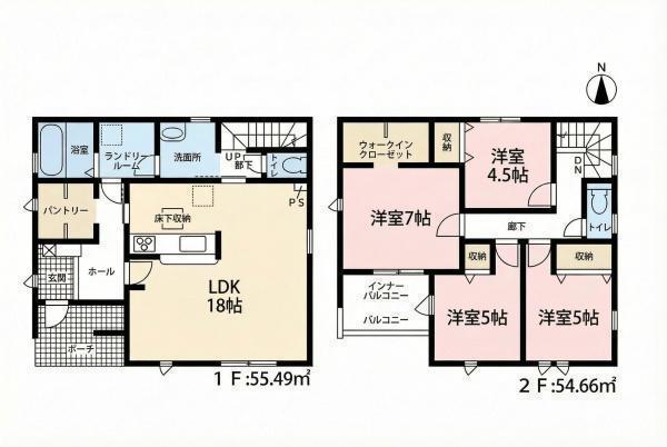 1F LDK 18.0帖 、2F 洋 5.0帖 、2F 洋 5.0帖 、2F 洋 7.0帖 、2F 洋 4.5帖