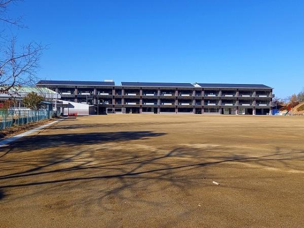 新築工事中の外観です。足場と養生シートが設置されており建物の完成が楽しみな段階です。広々とした敷地で車の出入りもスムーズです。周辺は開放感のある環境です。