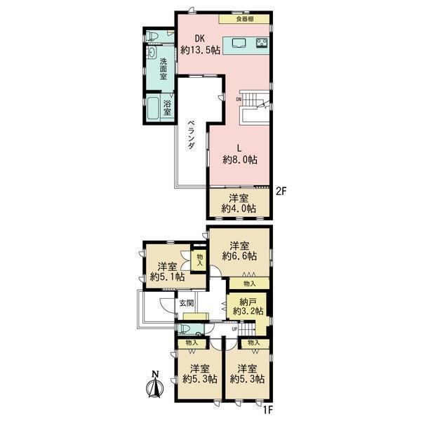 1F 洋 5.3帖 、1F 洋 5.3帖 、1F 洋 5.1帖 、1F 洋 6.6帖 、1F S(納戸) 3.2帖 、2F DK 13.5帖 、2F 洋 4.0帖