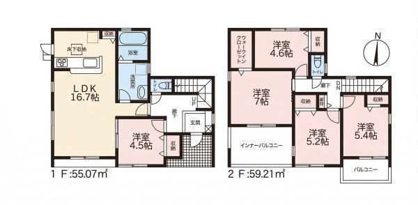 1F LDK 16.7帖 、1F 洋 4.5帖 、2F 洋 7.0帖 、2F 洋 5.2帖 、2F 洋 5.4帖 、2F 洋 4.6帖