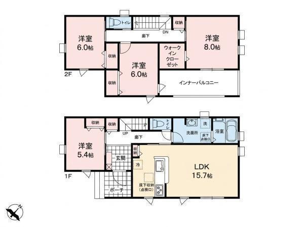 1F LDK 15.7帖 、1F 洋 5.4帖 、2F 洋 8.0帖 、2F 洋 6.0帖 、2F 洋 6.0帖
